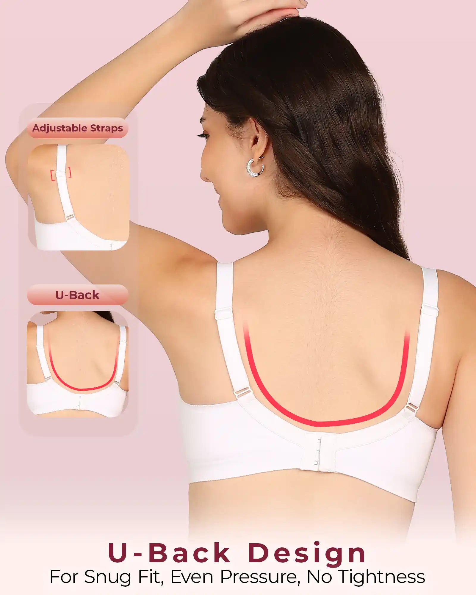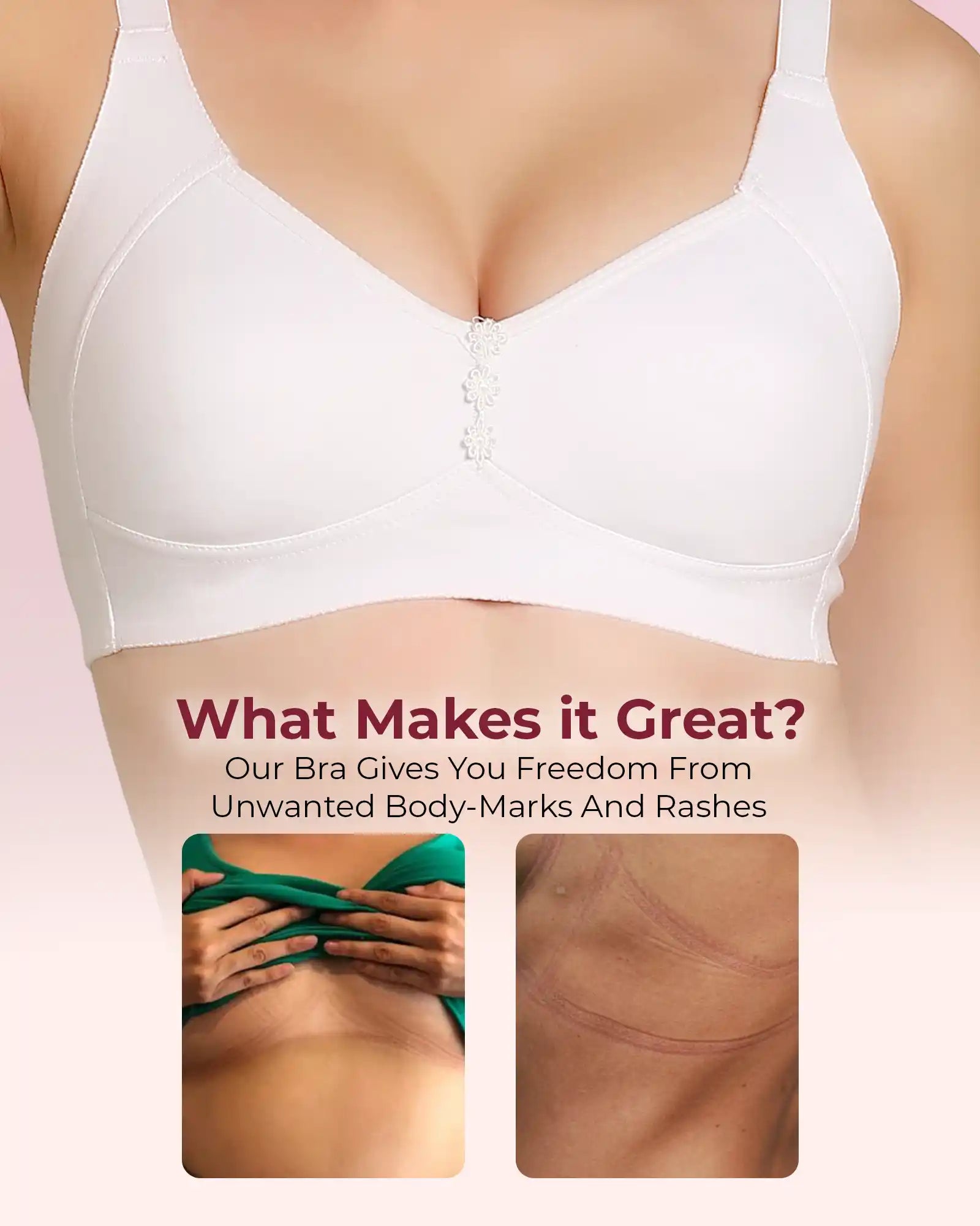 Elastic-Free Bottom Band: The underband is designed without harsh elastic so there’s no pinching, no tight body marks and no rashes—just soft, comfortable support around your ribcage.